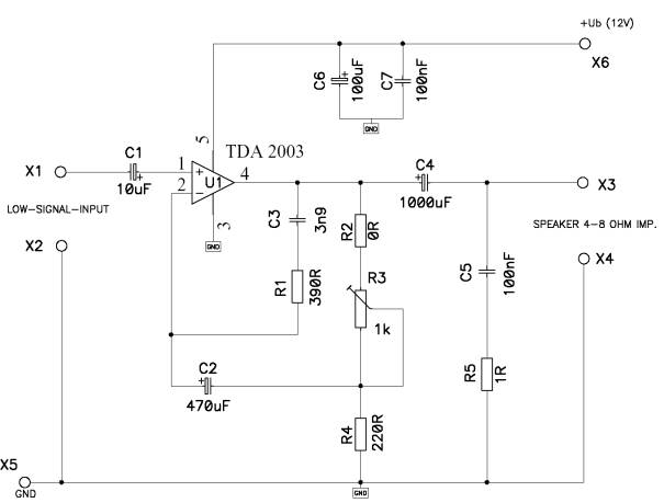 wird ein 8W Mono NF-Verstärker IC mit dem Namen TDA 2003. Die Beschaltung ist